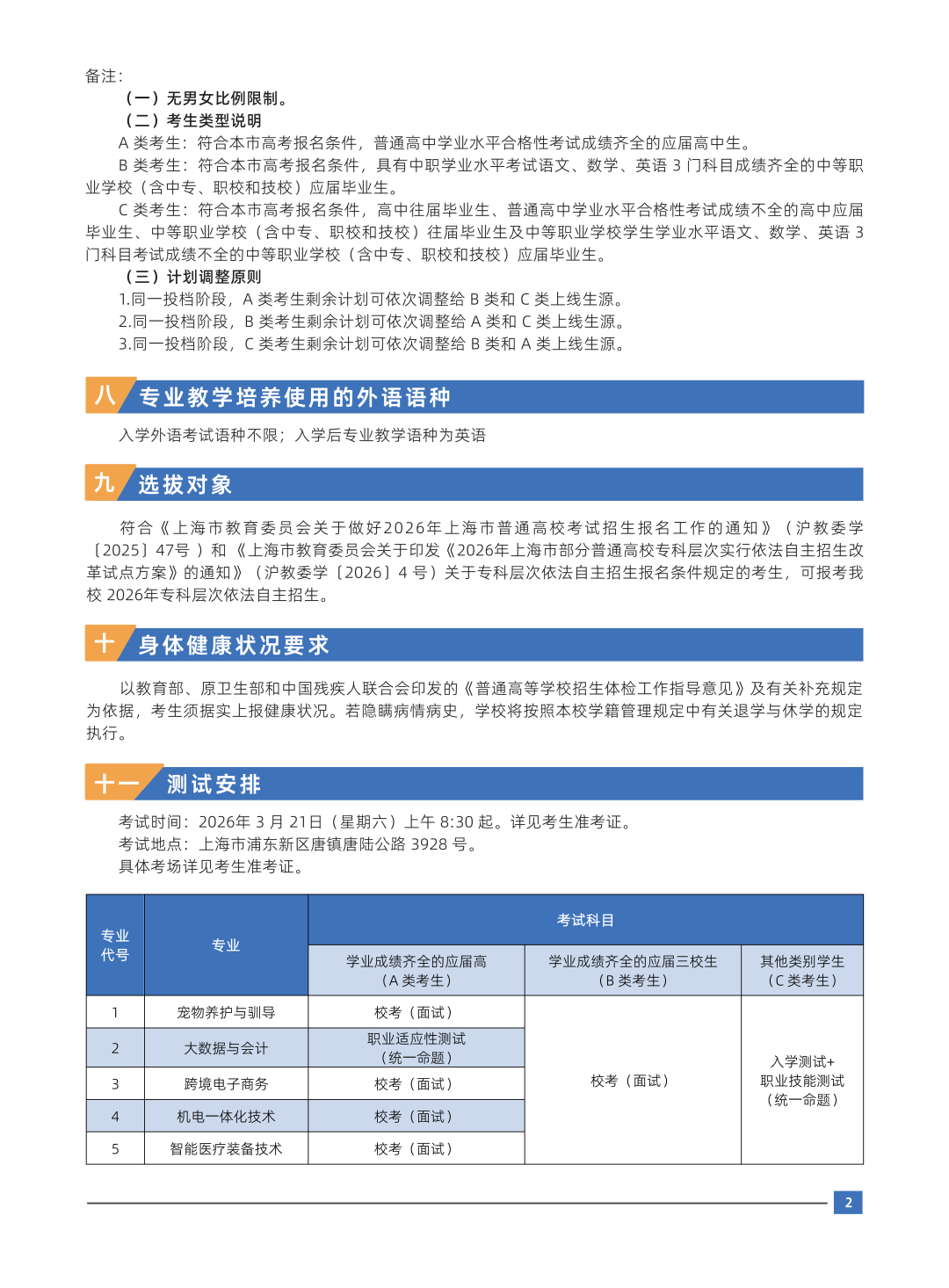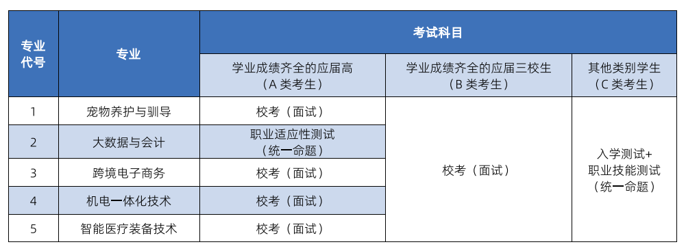 (2)普通专业参加统一命题的职业适应性测试 ,其测试办法 :文化基础 150分 、 职业与心智 90分 、 专业通识基础 60分 , 总分值 300 分。宠物养护与驯导、跨境电子商务、机电一体化技术、智能医疗装备技术参加由学校组织的校考(面试),满分为300分。