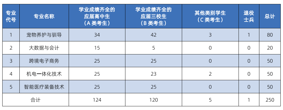2026年我校专科层次依法自主招生专业5个,招生计划数 250人,其中:学业成绩齐全的应届高中生 124名;学业成绩齐全的应届三校生 120名;学业成绩不齐全的应届三校生和应届高中生、历届三校生、历届高中生(统称其他类别学生)5名;退役士兵1名。