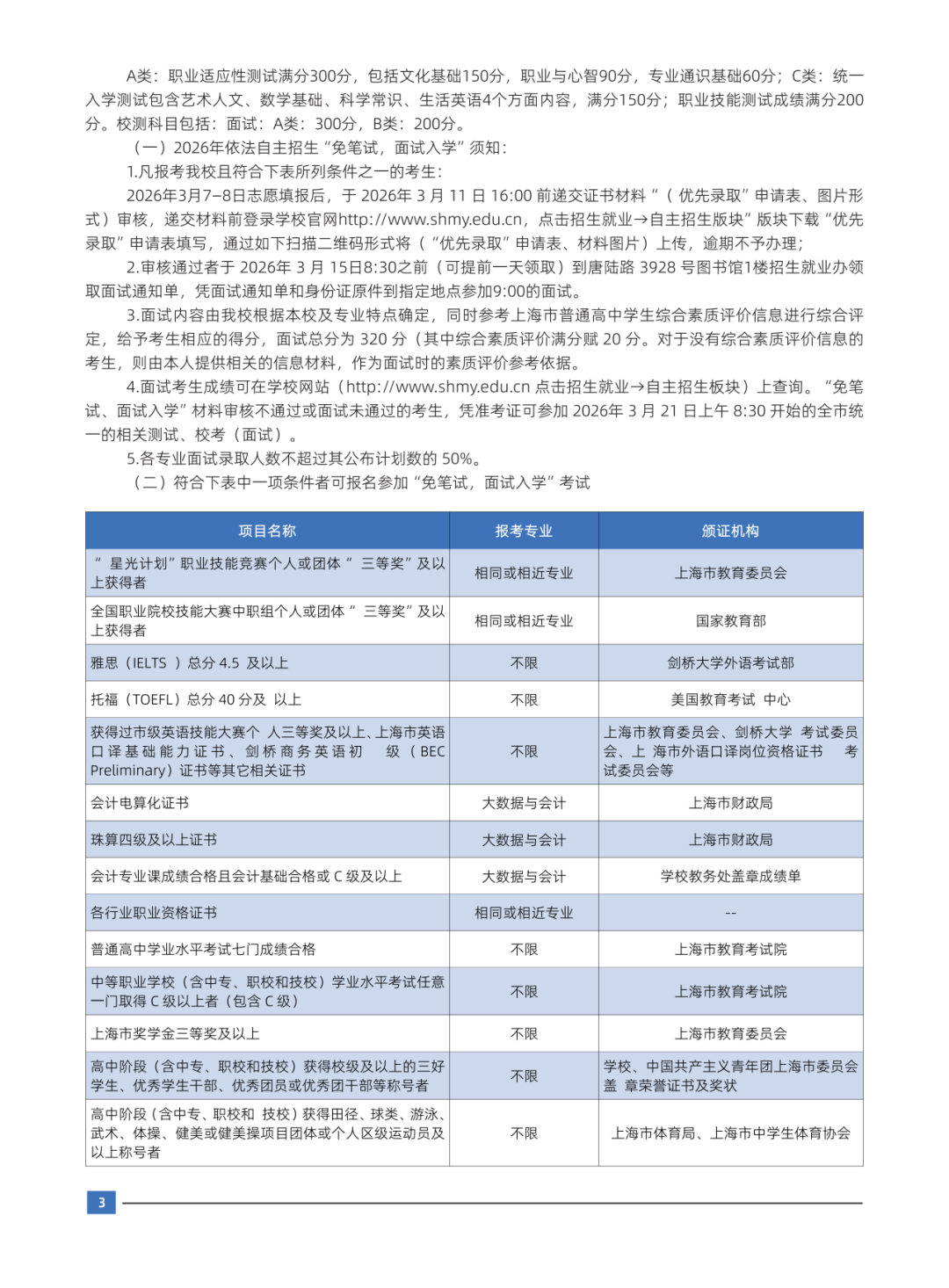4.面试考生成绩可在学校网站(http://www.shmy.edu.cn 点击招生就业→自主招生板块)上查询。“免笔试、面试入学”材料审核不通过或面试未通过的考生,凭准考证可参加 2026年 3 月 21 日上午 8:30 开始的全市统一的相关测试、校考(面试)。