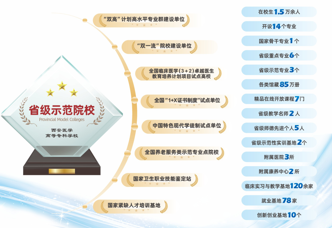 西安医学高等专科学校是经国家教育部批准设立,陕西省教育厅主管的一所全日制医学类普通高等学校。目前,学校开设14个专业,形成了医疗、医养、医药等3个专业集群,覆盖了医、护、药、技等多个专业领域。校园环境优雅,学习氛围浓厚,被誉为“成长成才乐土,白衣天使摇篮”。