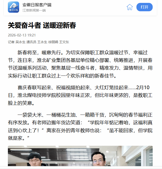 新春将至,暖意先行。为切实保障职工群众温暖过节、幸福过节,连日来,淮北矿业集团各基层单位精心部署、统筹推进,开展春节送温暖系列活动,聚焦基层一线奋斗者,精准发力、温情帮扶,用实际行动让职工群众过上一个欢乐祥和的新春佳节。