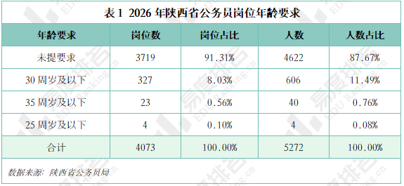 2026年陕西省公务员共有4073个岗位招录,总计招收5272人。同国家公务员考试政策一致,陕西省公务员报考条件调整年龄要求为18周岁以上、38周岁以下(1987年2月至2008年2月期间出生),对于2026年应届硕士、博士研究生,放宽到43周岁以下(1982年2月以后出生)。