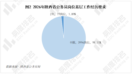 98.11%岗位对基层工作经历没有要求,仅77个岗位(占比1.89%)要求2年基层工作经历。