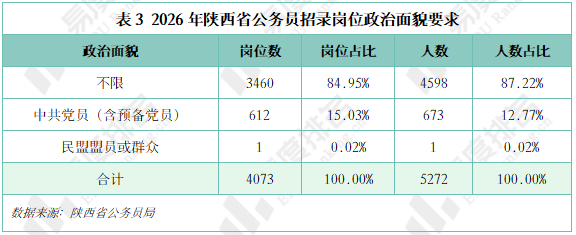 下表展示了2026年陕西省公务员招录岗位对政治面貌的要求情况。其中不限政治面貌的岗位占比为84.95%,要求中共党员(含预备党员)的岗位占比15.03%,要求民盟盟员或群众的计划仅有1个,来自中国民主同盟西安市委员会。