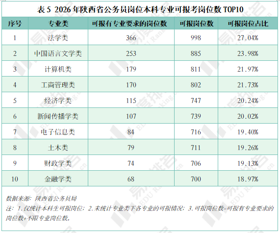 陕西省2026年公务员招录岗位专业要求统计显示,在本科生可报考岗位中,632个岗位未设置专业限制。专业类可报考岗位数统计结果表明,法学类本科生可报考366个有专业要求的岗位,叠加不限专业岗位后,其可报考岗位占比达27.04%,居各专业类之首。中国语言文学类、计算机类、工商管理类紧随其后,可报考岗位占比均超21%。从专业类前十来看,政法、经管、文学相关专业在公务员招录中仍保持优势地位,理工科中,计算机类、电子信息类、土木类专业亦表现突出,可报考岗位数量可观。