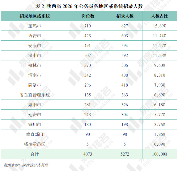 宝鸡市有710个岗位招录827人,位列首位,省会西安招录603人,位列第二。省垂直管理系统、垂直部门分别招录363人、98人,杨凌示范区招录岗位最少,仅招录5人。
