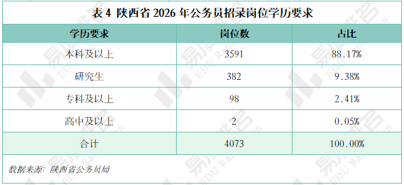 陕西省2026年公务员招录岗位中,要求学历为本科及以上的岗位数量最多,占总数的88.17%,要求学历为高中及以上的岗位数量最少,仅有2个。从学历要求看,本科生可报考3691个岗位,占岗位总数的90.62%。
