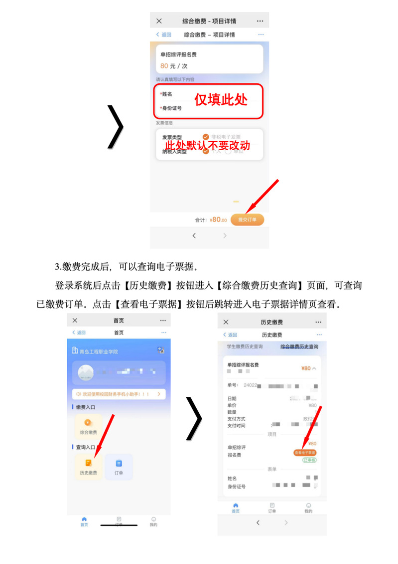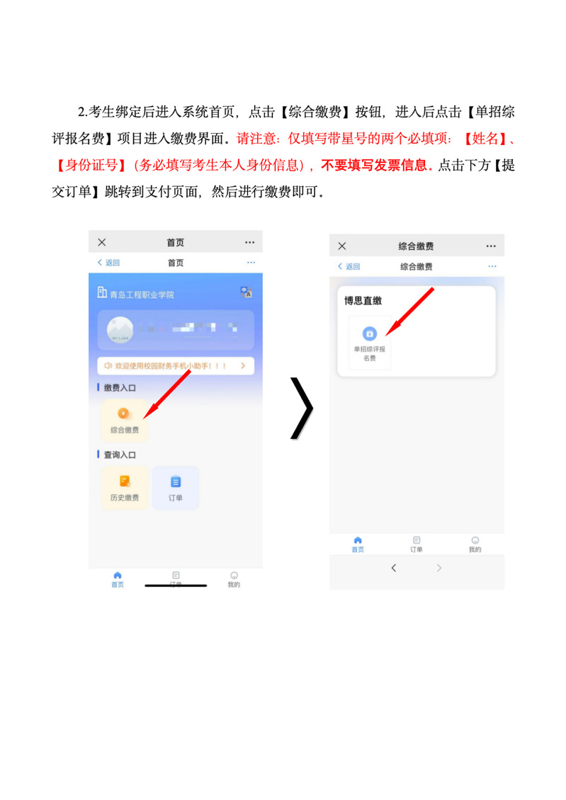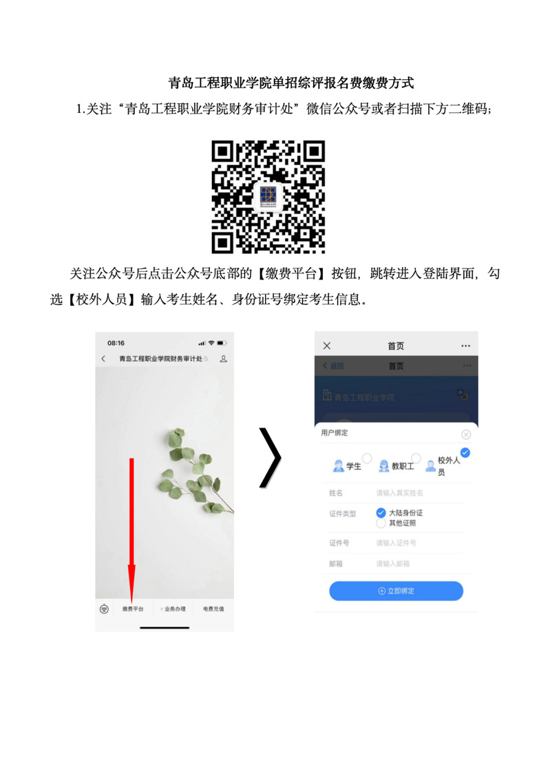 已完成单独招生和综合评价招生志愿填报并报考青岛工程职业学院(学院代码:14666)的考生,请关注“青岛工程职业学院财务审计处”微信公众号,缴纳报名考试费80元。具体操作步骤如下: