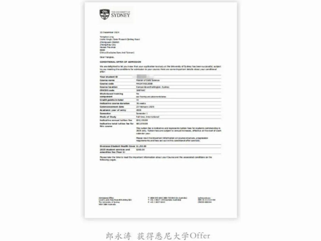最终,所有投入都转化为可见的回报。2025年,他陆续拿到悉尼大学(QS25)、利兹大学(QS86)、诺丁汉大学(QS97)、玛丽女王大学(QS110)、纽卡斯尔大学(QS137)等全球知名大学的录取通知书。他选择悉尼大学的数据科学专业,不仅因为它的国际影响力,更因为他相信自己在这里能够看到更大的技术世界。“风雪压我两三年,我笑风轻雪如棉。”他喜欢把这句话写在笔记本首页。不是要显得坚强,而是提醒自己:真正的成长往往悄无声息,它不喧哗、不急躁,却能最终抵达远方。
