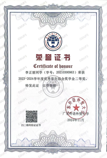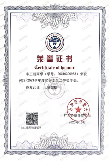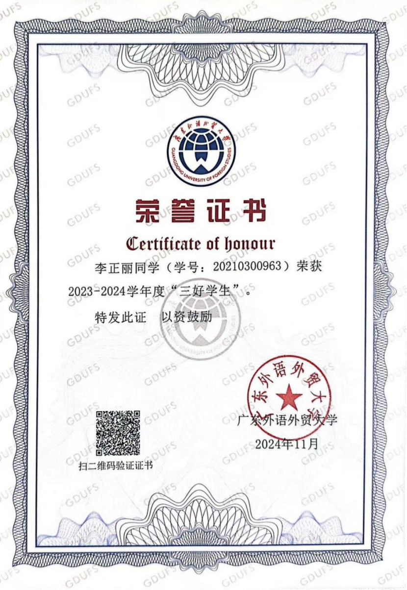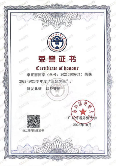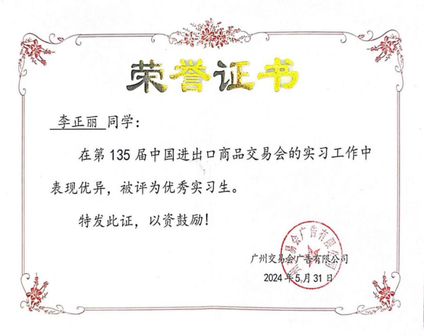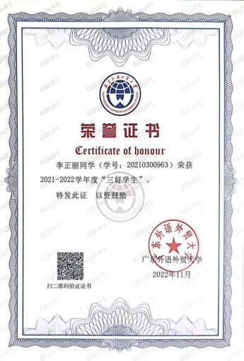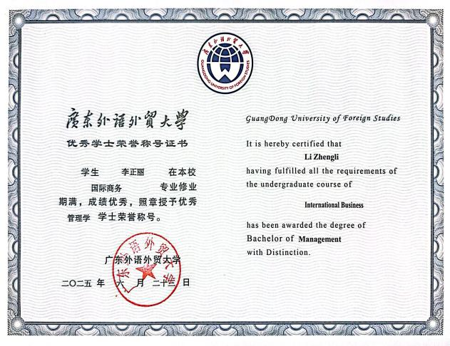 获奖情况:校级“三好学生”、校级综测二等奖、优秀共青团员、广交会优秀实习生、“挑战杯”竞赛优秀奖、优秀学士荣誉称号、毕业班优秀学生奖学金