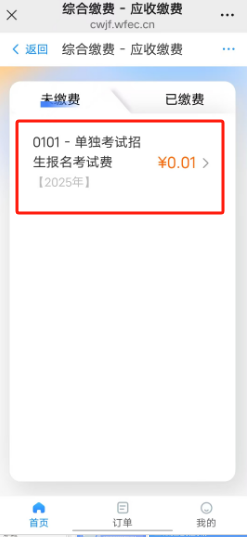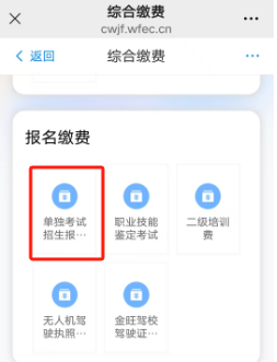 3、在缴费入口位置点击“综合缴费”,点击“单独考试招生报名考试费”