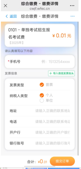 - 点击缴费项目,在弹出的界面中输入“手机号”(必填项),缴费金额:70.00元,点击“提交订单”,点击“微信支付”即可。