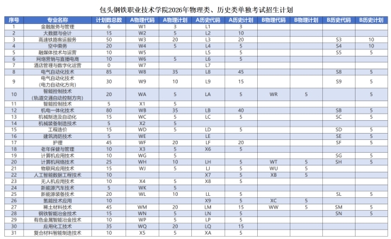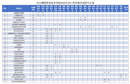 有关我院单独考试招生事宜,请及时关注我院官方微信公众号后续发布的《包头钢铁职业技术学院2026年单独招生考试须知》。