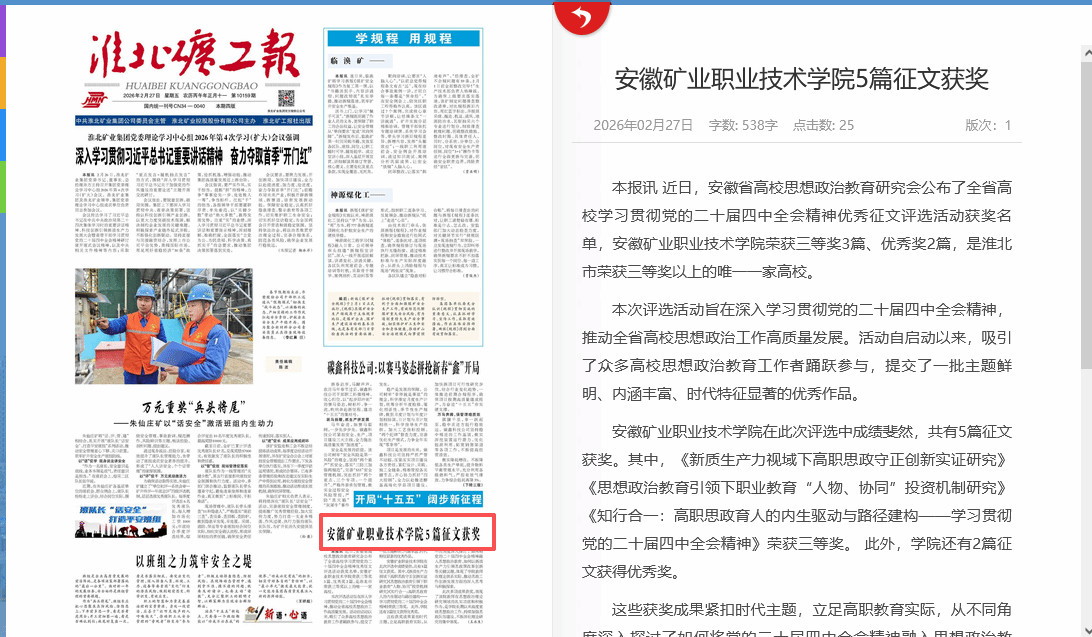 安徽矿业职业技术学院在此次评选中成绩斐然,共有5篇征文获奖。其中,《新质生产力视域下高职思政守正创新实证研究》《思想政治教育引领下职业教育“人物、协同”投资机制研究》《知行合一:高职思政育人的内生驱动与路径建构——学习贯彻党的二十届四中全会精神》荣获三等奖。 此外,学院还有2篇征文获得优秀奖。