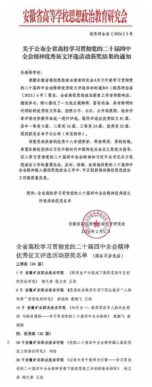 近日,安徽省高校思想政治教育研究会公布了全省高校学习贯彻党的二十届四中全会精神优秀征文评选活动获奖名单,安徽矿业职业技术学院在全省120多所高校中成绩亮眼,一举荣获三等奖3篇和优秀奖2篇,也是淮北市荣获三等奖以上的唯一一家高校。