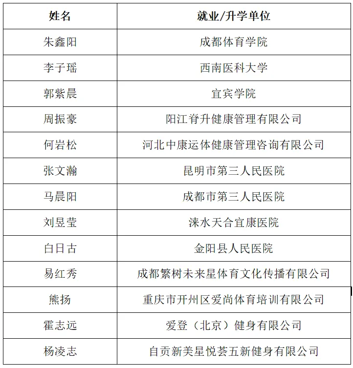 基本介绍 体育保健与康复专业培养理想信念坚定,德、智、体、美、劳全面发展,具有一定的科学文化水平,良好的人文素养、职业道德和创新意识,精益求精的工匠精神,较强的就业能力和可持续发展的能力;系统掌握康复医学和运动科学、德国MTT医学运动康复的知识体系,以及现代康复诊疗和运动伤害防护等技能,熟悉运动规律,能在运动队、医院、社区、运动康复中心、健身机构等部门,从事肌肉骨骼损伤、慢性疾病的康复治疗和运动伤害防护等方面工作的高素质技能人才。 核心课程 《康复评定技术》、《运动治疗技术》、《中医传统疗法》、《运动伤病防护与急救》、《体质测量与评定》、《运动处方》、《肌肉骨骼康复》、《物理因子疗法》。 职业证书 本专业为学生搭建多元化职业能力提升通道,可考取运动防护师、社会体育指导员、教师资格证(体育)、保健按摩师、运动营养师、养老护理员、健康管理师等权威职业证书,多证加持助力拓宽就业路径,增强职场核心竞争力。 就业 就业渠道广阔,岗位适配性强。毕业生可入职各级运动队、运动康复中心、体适能馆、健身房、养生馆、养老院、部队、消防队,从事运动康复师、运动防护师、体适能教练、健身教练等岗位工作,凭借扎实的专业技能与良好的职业素养,深受用人单位青睐。 部分毕业生就业情况