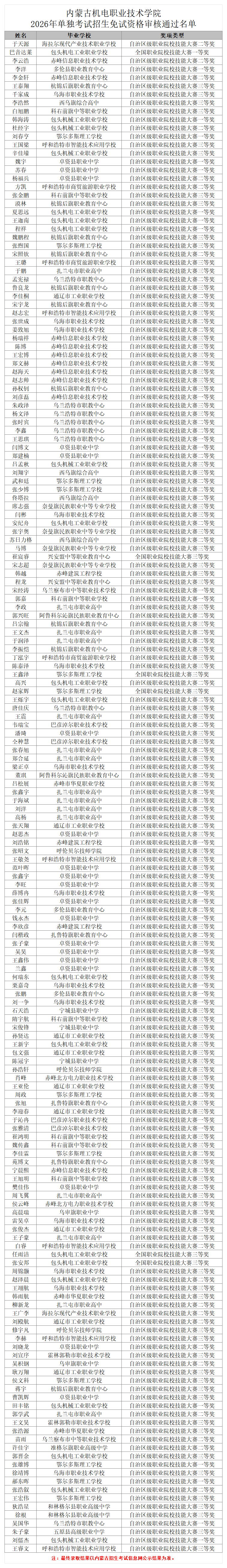 按照《内蒙古自治区教育厅关于做好2026年高等职业院校单独考试招生工作的通知》(内教学函〔2025〕52号)《内蒙古机电职业技术学院2026年单独招生实施方案》要求,依据学院2026年单独考试招生免试资格审核工作安排,经学院单招免试资格审核小组严格审核,现将本次免试资格审核通过名单予以公示(公示名单附后)。