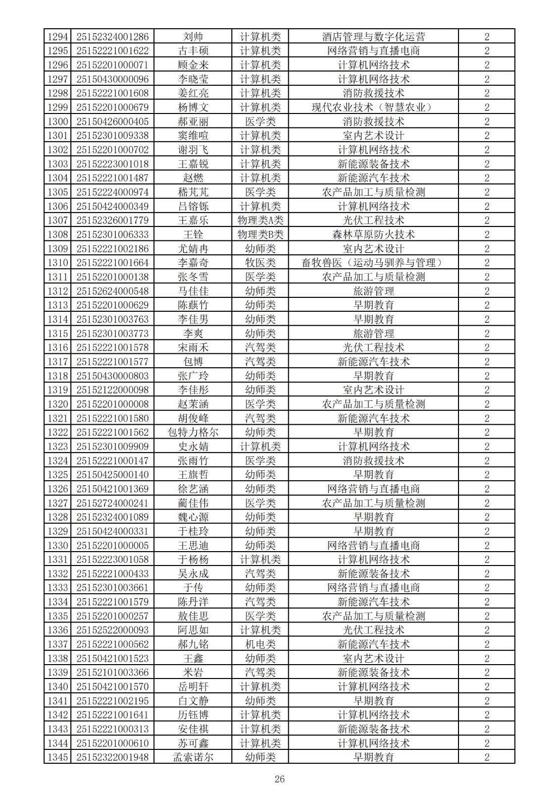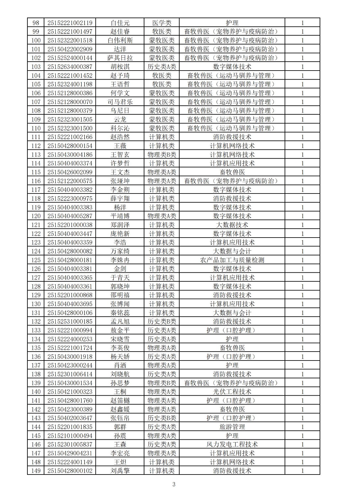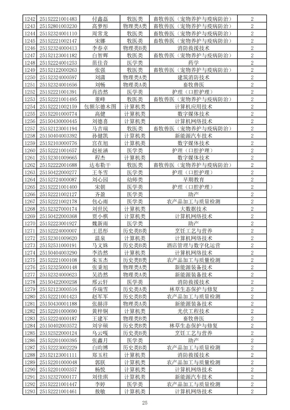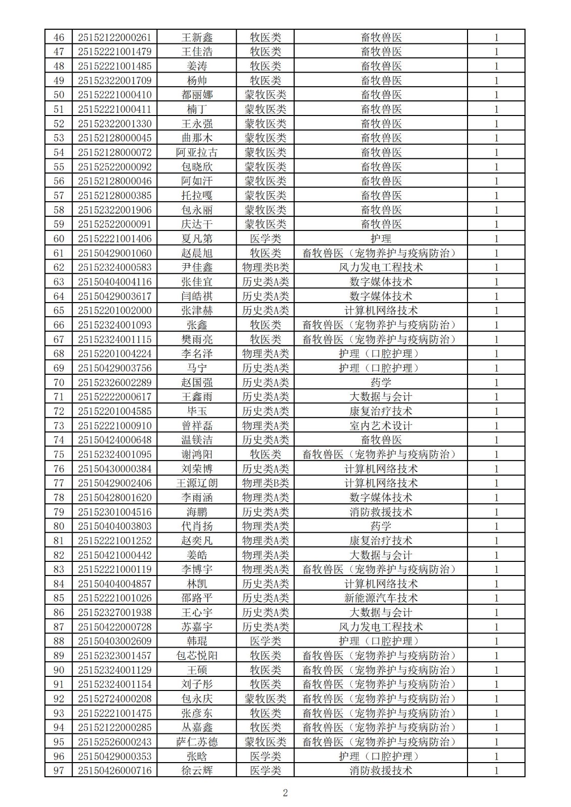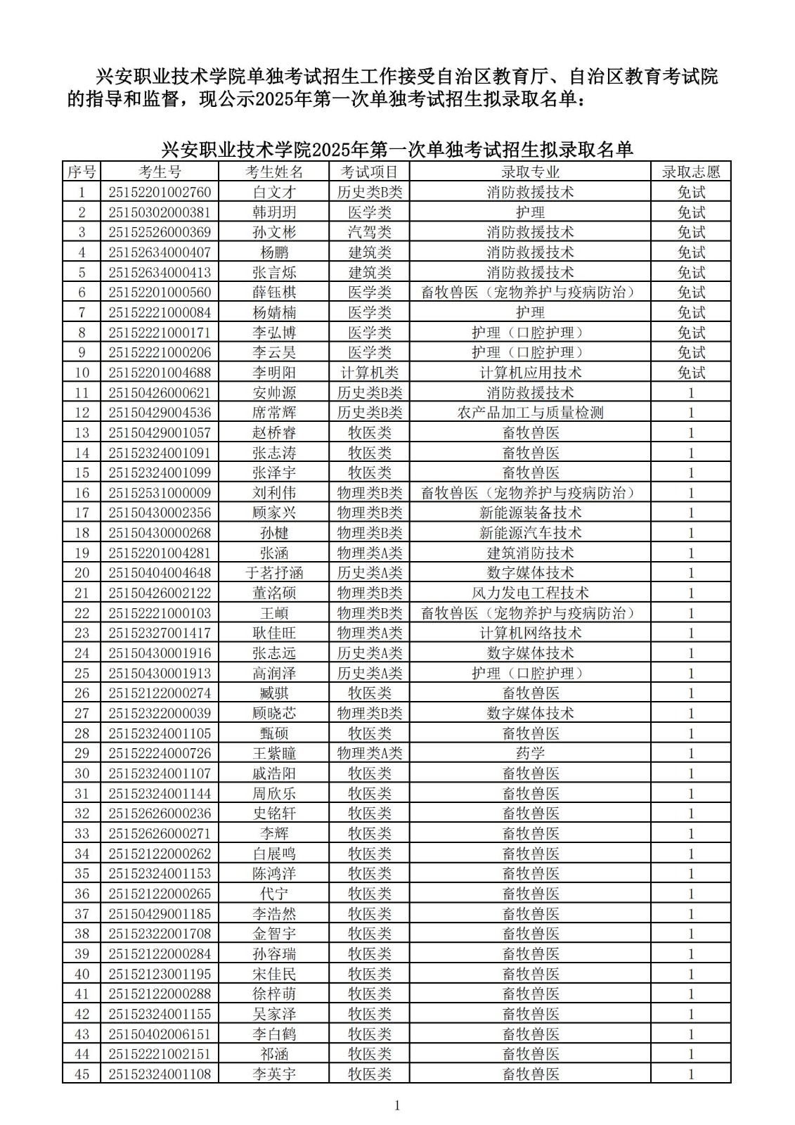 兴安职业技术学院2025年第一次单独考试招生拟录取名单