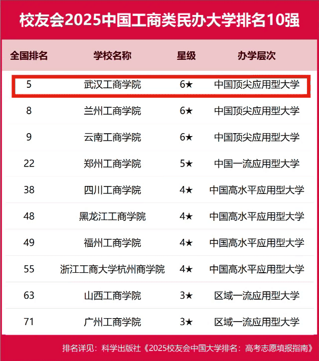 1月6日,艾瑞深校友会网正式发布校友会2025中国大学排名,武汉工商学院在中国民办大学排名Ⅲ类中位居第五,荣膺2025中国六星级民办大学,办学层次为中国顶尖应用型大学。学校在中国工商类民办大学中办学实力最强、最具竞争力、办学水平最高,雄居榜首,这也是学校连续四年位居该排行榜榜首。