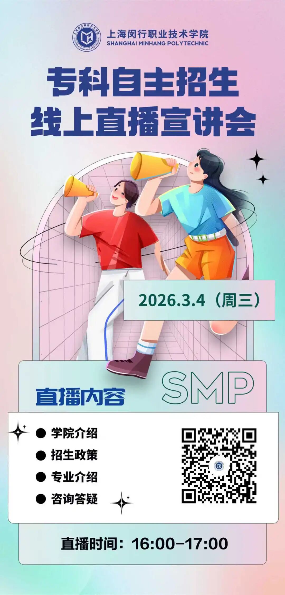 为方便广大考生及家长全面了解闵职院2026年专科自主招生信息,我院将于3月4日(周三)下午16:00举办线上直播宣讲会。届时招生处、各专业老师将在线解读招生政策、介绍专业特色,并实时答疑解惑,敬请扫码预约提前锁定直播间。