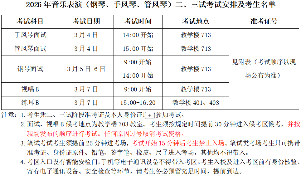 音乐表演(手风琴)面试03月04日下午713教室 音乐表演(管风琴)面试03月04日下午713教室 音乐表演(钢琴)面试03月05日上午713教室 音乐表演(钢琴)面试03月05日下午713教室 音乐表演(钢琴)面试03月06日上午713教室 音乐表演(钢琴)面试03月06日下午713教室 音乐表演(手风琴)视唱B03月07日上午713教室 音乐表演(管风琴)视唱B03月07日上午713教室 音乐表演(钢琴)视唱B03月07日上午713教室 音乐表演(手风琴)练耳B03月07日下午401教室 音乐表演(管风琴)练耳B03月07日下午401教室 音乐表演(钢琴)练耳B03月07日下午401教室 音乐表演(钢琴)练耳B03月07日下午403教室