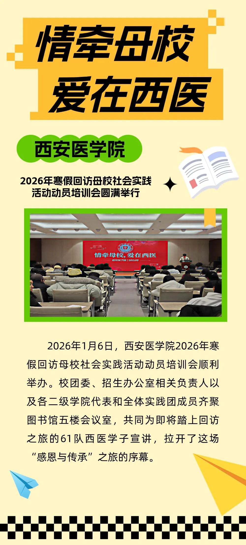 怀揣着母校的祝福与期望,西医学子已整装待发。愿他们带着青春热忱与专业底气,在回访之路上传递温暖、播撒梦想,为母校与高中搭建起双向奔赴的育人桥梁,让更多有志青年与西安医学院相约,共赴医学报国的美好未来!