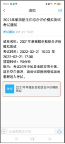 学校一般在测试科目开考前1个小时发起测试通知,考生登录系统后,点击通知,待测试时间到时即可进入测试。测试通知是进入测试的唯一凭证,请勿删除。