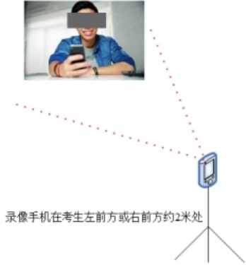 用于对测试全过程进行录像。要求手机性能稳定、剩余存储空间大(能够容纳考生参考测试科目的几个小时录像,考试可以适当将录像的分辨率调低以减少存储空间占用),测试过程中请连接充电器,预防中途手机电量耗尽。测试录像考生自行保存,录取后到校报到时备查。手机从考生左前方或右前方距离本人2m左右处拍摄,建议高度略高于考生坐姿,用于采集考生所处的环境,要开启视频、音频录制模式,要求能够监控考生的周边情况以及考生全身、双手位置及屏幕。