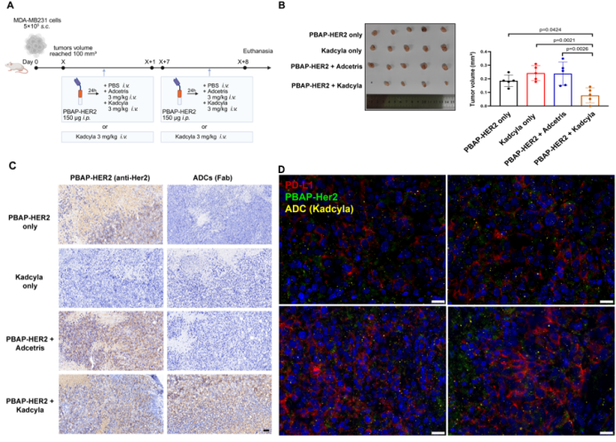 该研究的另一突出亮点在于PBAP平台的模块化适配能力——相当于该平台是“可替换零件”的,能根据不同肿瘤调整,打破抗原限制。研究团队将病毒抗原替换为HER2蛋白结构域,构建了PBAP-HER2融合蛋白。在HER2阴性但PD-L1阳性的MDA-MB-231乳腺癌模型中,PBAP-HER2成功“标记”肿瘤细胞,使原本仅对HER2阳性肿瘤有效的曲妥珠单抗(Herceptin)及抗体药物偶联物Kadcyla(T-DM1)能够识别并杀伤HER2阴性肿瘤。
