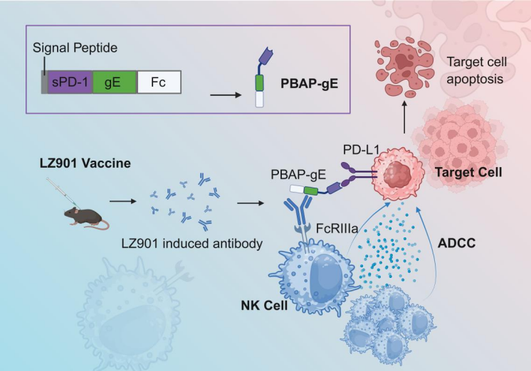 PBAP-gE联合LZ901疫苗诱导抗体协同NK细胞发挥抗肿瘤活性示意图