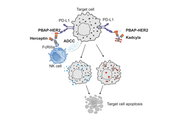 PBAP-Her2联合曲妥珠单抗(Herceptin)协同NK细胞或联合恩美曲妥珠单抗(Kadcyla, ADC)药物独立发挥抗肿瘤活性示意图