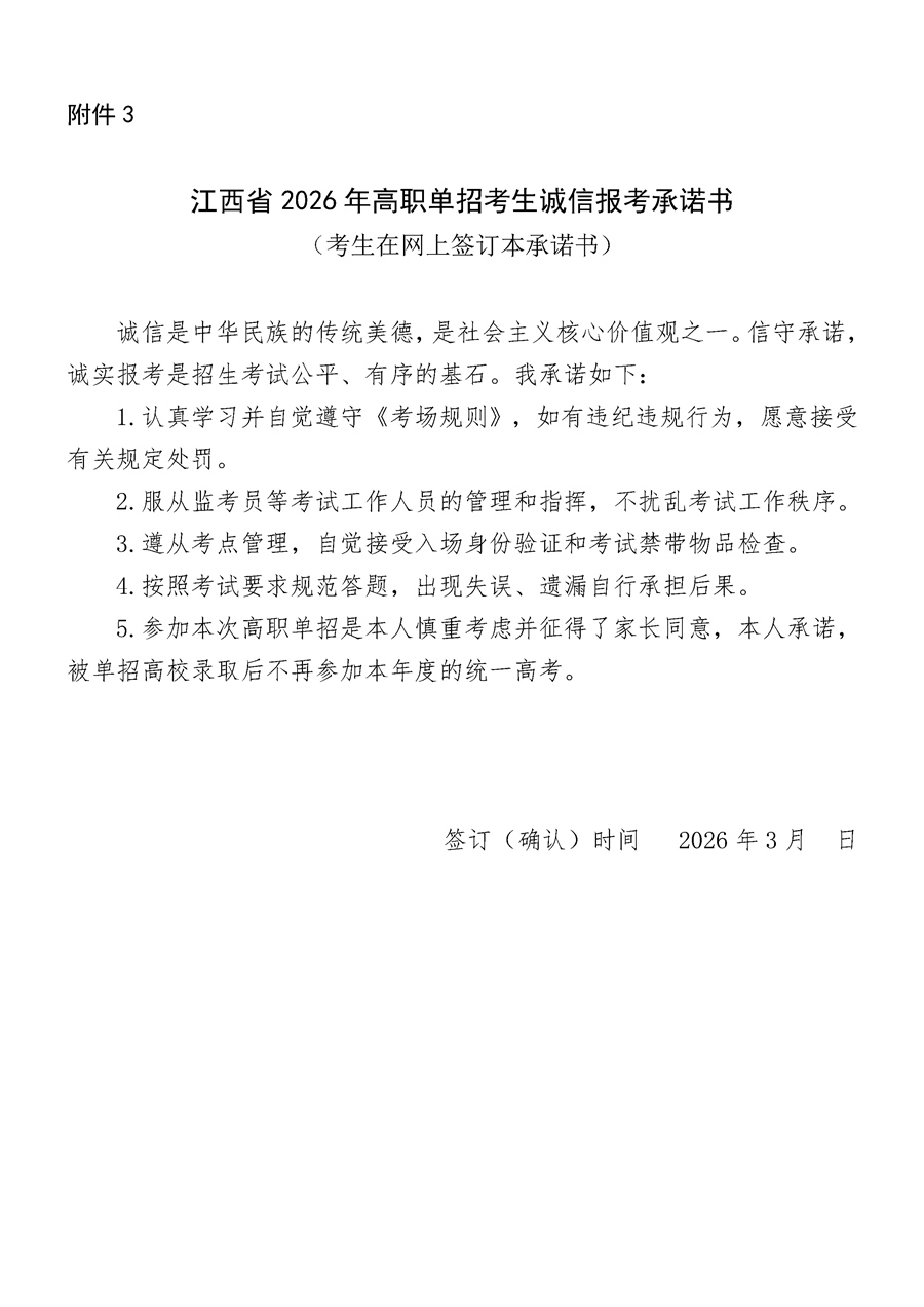 2.网上报考:2026年3月9日9:00-11日17:00期间,所有参加高职单招的考生均须自行登录江西省教育考试院网(网址:www.jxeea.cn)“高职单招报考系统”进行网上报考。报考前,考生须在网上仔细阅读考生须知,了解报考流程、考试要求和注意事项,阅读并签订《江西省2026年高职单招考生诚信报考承诺书》(见附件,承诺高职单招录取后不再参加2026年6月举行的统一高考)。每个考生限报1所高校,可选不超过6个专业及是否服从专业调剂,在规定的网报时间内,考生可以对所报考院校及专业修改2次。(赣西科技职业学院报考代码8631)