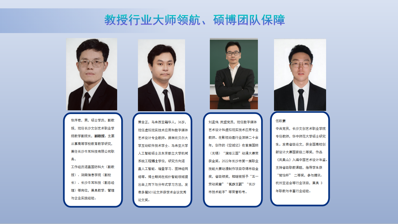 师资队伍结构优良,专业团队汇聚硕博人才与行业精英,包括人工智能博士萧全正、影视动画行业专家刘孟伟等,同时聘请企业技术骨干担任兼职教师。