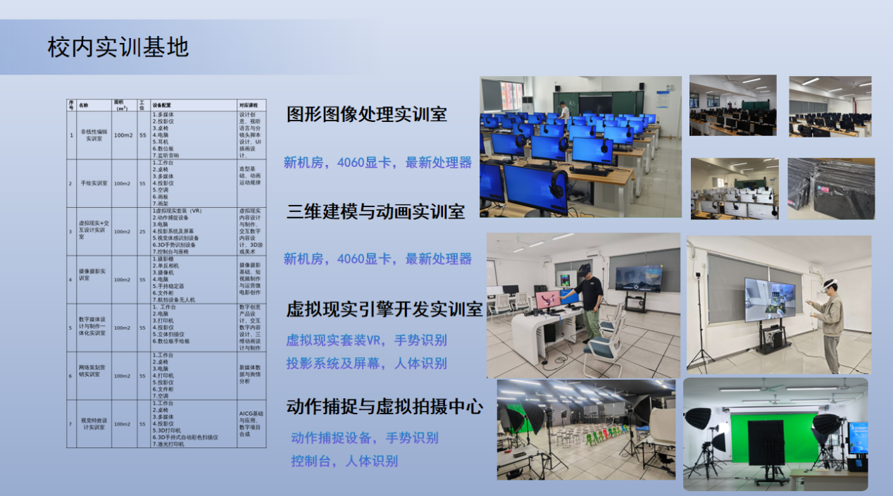新媒体艺术学院,专业教学设施省内领先,建有13间专业实训室,包括虚拟现实+交互设计实训室、动作捕捉与虚拟拍摄中心、三维建模与动画实训室等,配备VR套装、动作捕捉设备、4060显卡高性能机房等先进设备,仪器设备值超200万元。校内“虚拟现实协同创新中心”总面积超500平方米,集教学、实训、研发、展示于一体。