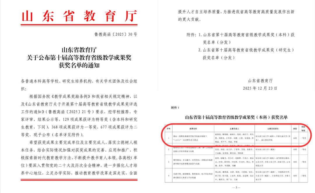 日前,山东省教育厅正式公布第十届高等教育省级教学成果奖获奖名单。泰山科技学院与哈尔滨工业大学(威海)、中国石油大学(华东)联合申报的教学成果《锚定一线聚焦难题的学院书院融合构架下“14591”一站式特色育人模式》荣获一等奖(本科类)。这是泰山科技学院在教育教学改革与协同育人领域取得的重要突破,也是校际合作、协同创新的又一标志性成果。书院制在集合社区服务、通识教育、专业培养与人格养成的“一站式”育人模式中显示出优势地位。