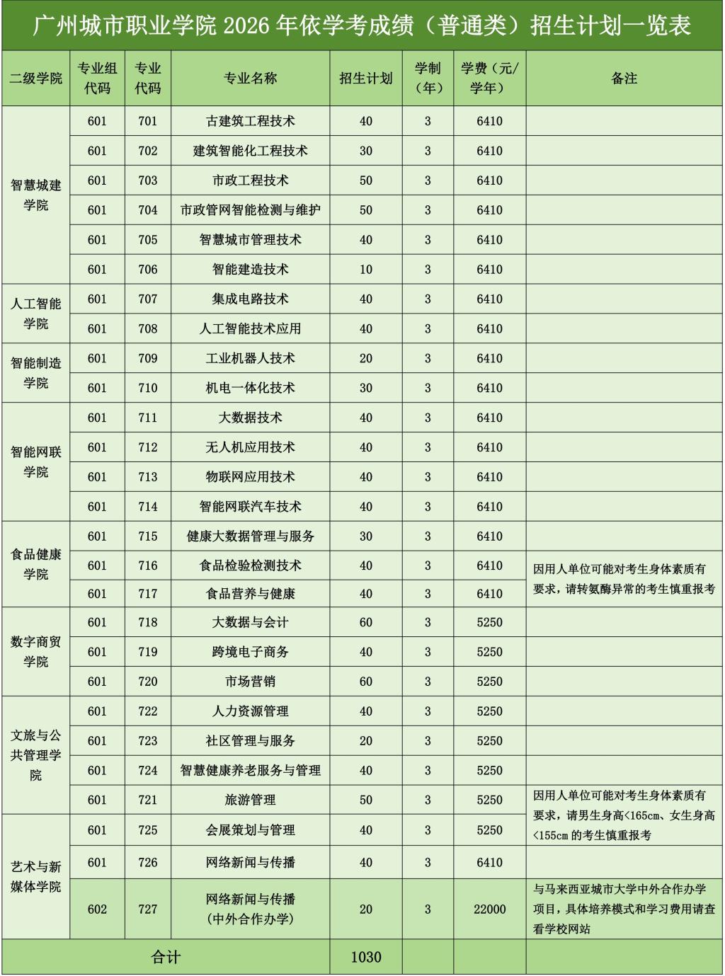 广州城市职业学院2026年春季高考依学考成绩(普通类)招生计划