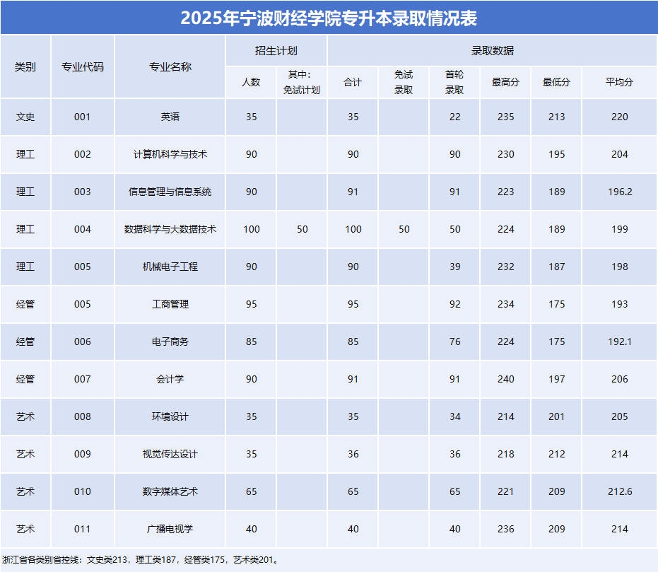 2025年宁波财经学院专升本录取情况表