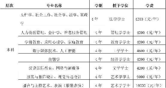 学校设有妇女发展学院、法学院、社会工作学院、儿童发展与教育学院、文化传播与艺术学院、管理学院、数据科学与信息技术学院、马克思主义学院、体育部、国际教育学院等教学院部。设有法律、社会工作、教育3个专业硕士授权点,社会学一级学科硕士学位授权点。本科现有招生专业20个,涵盖法学、教育学、管理学、经济学、文学、艺术学、工学7个学科门类。学前教育、法学、女性学、服装与服饰设计、播音与主持艺术5个专业为国家一流专业建设点,社会工作、汉语国际教育、人力资源管理3个专业为北京市一流专业建设点。