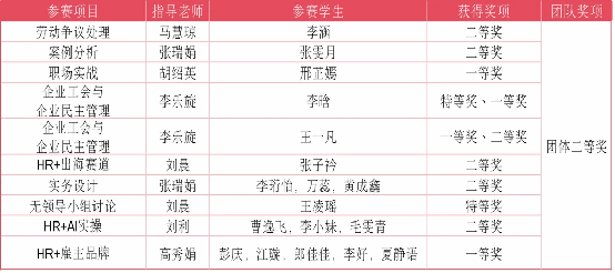 本次赛事中,我校参赛团队在9个赛道奋勇争先,共斩获特等奖2项、一等奖4项、二等奖7项、团体二等奖1项的佳绩!个人荣誉与团队成绩交相辉映,充分展现了我校学子在人力资源管理领域的专业素养与协作能力。在“企业工会与企业民主管理”“无领导小组讨论”两大赛道中,李晗同学、王凌瑶同学凭借专业积淀斩获特等奖,彰显了扎实的理论功底与实战能力;“职场实战”“企业工会与企业民主管理”和“雇主品牌”赛道表现尤为突出,邢芷嫣、王一凡分别拿下个人一等奖,彭庆、江璇、郎佳佳、李好、夏静语等同学拿下团体一等奖,成为该赛道的核心竞争力;劳动争议处理项目、实务设计、HR+AI实操、案例分析、HR+出海赛道等项目中均荣获二等奖,展现了在人力资源管理等领域的专业素养与协作能力。