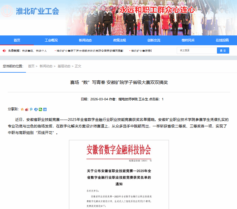 在数字经济蓬勃发展的今天,高素质技术技能人才已成为支撑产业升级的关键力量。安徽矿业职业技术学院此次“中职高职双获奖”,不仅展现了不同层次人才培养的均衡发力,更折射出职业教育类型定位的独特价值。