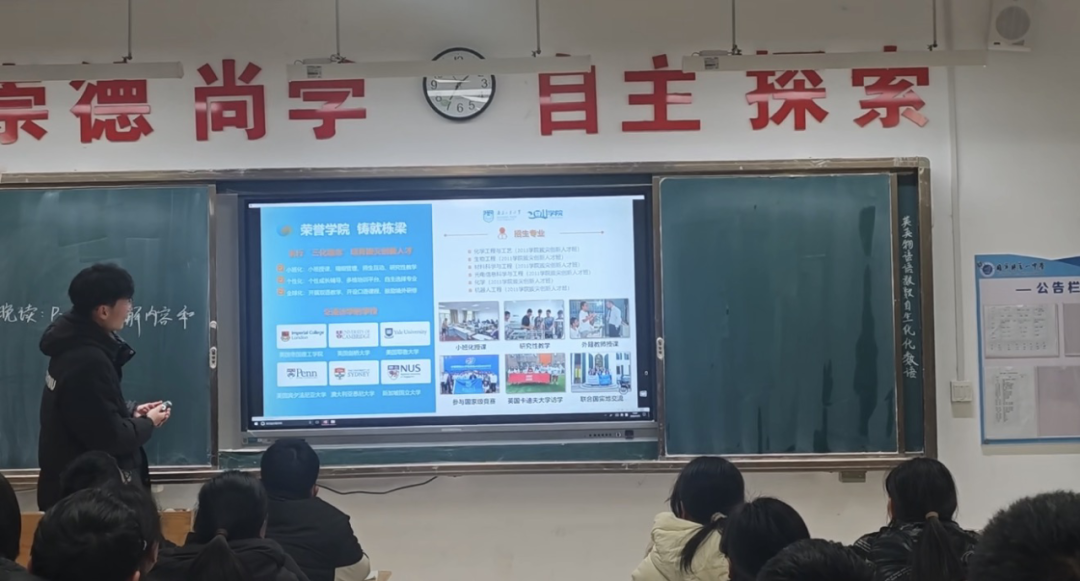 02队员丁子骞分享道:本次母校行宣讲,我主要负责向学弟学妹们真实展现我校的日常学习与生活画卷。我以一名新生的视角,从“学食住行”四个方面进行了生动介绍。在专业学习方面,我并未空泛罗列名单,而是结合自身就读感受,重点描绘了学校的优势学科群和“厚基础、重交叉”的培养特色。我分享了在国家重点实验室、藏书丰富的图书馆学习的体验,并展示了学长学姐们在重大赛事中的获奖成果,让“办学实力”变得具体可感。在生活方面,我通过精心拍摄的图片与视频带他们“云体验”校园以及周边便利的交通与配套商场。