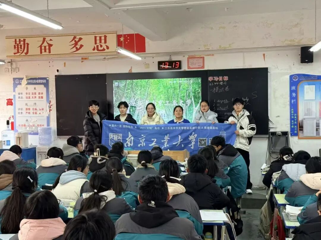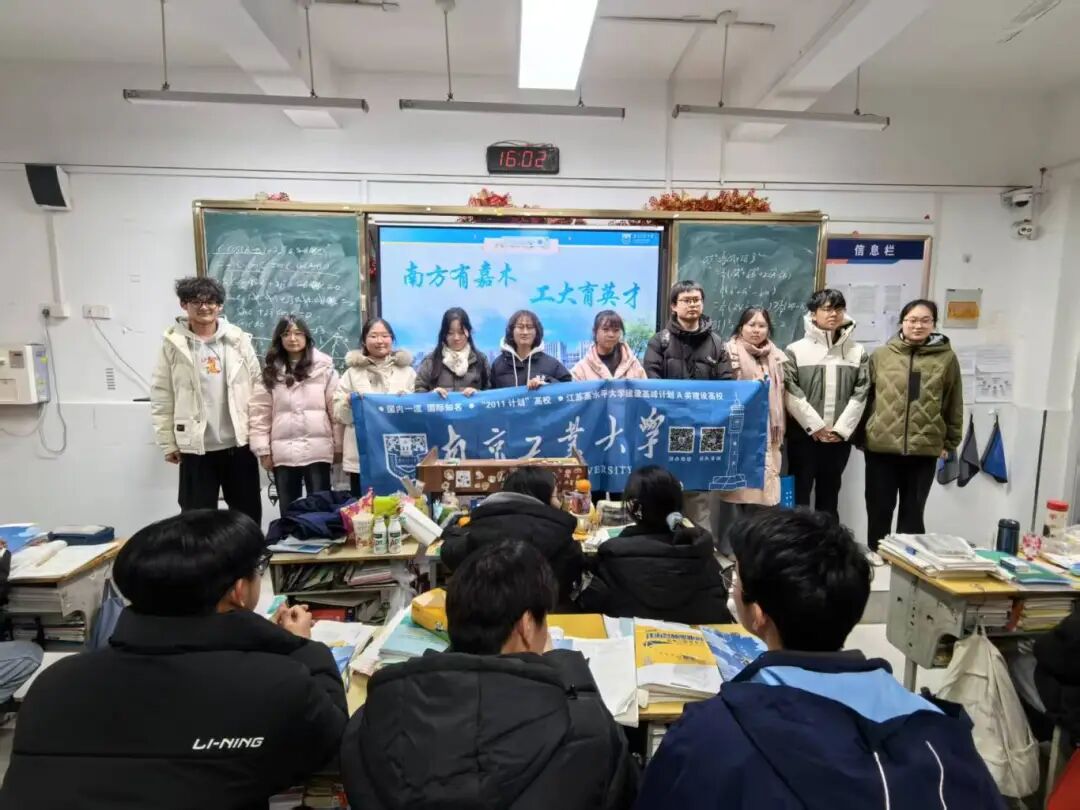 02队长闫雨彤分享道:作为队长,我带领团队圆满完成了回母校宣传南京工业大学的寒假社会实践活动。活动前,我们全体队员参加了学院组织的培训会,系统学习了学校的办学历史、学科优势及招生政策 。我们结合自身备考经历,精心准备了宣讲内容,力求将“明德、厚学、沉毅、笃行”的校训精神准确传达给学弟学妹。 重返母校,我们通过播放宣传片、PPT展示等方式,向高三学子全面介绍了南工大的校园文化、特色专业及就业前景 。在互动环节,我们分享了高考冲刺经验和丰富多彩的大学生活,现场气氛热烈,学弟学妹们对“南京最美高校”充满了向往。