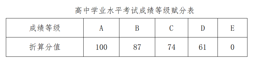 根据考生浙江省高中学业水平考试成绩,由语文、数学、外语、X1科目、X2科目、X3科目高中学业水平考试成绩等级赋分相加得出的总分,依次从高分到低分按照招生计划的500%比例确定入围综合素质测试考生名单,不足500%则符合报考条件的考生全部入围。如遇成绩总分最低分同分的情况,则同分考生都允许参加综合素质测试。X1科目、X2科目、X3科目指除语文、数学、外语之外,其他七门科目中高中学考成绩等级最高的任意三门。成绩等级赋分见下表。以浙江省教育考试院提供的等级为准。