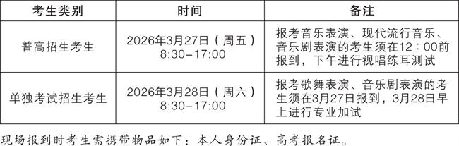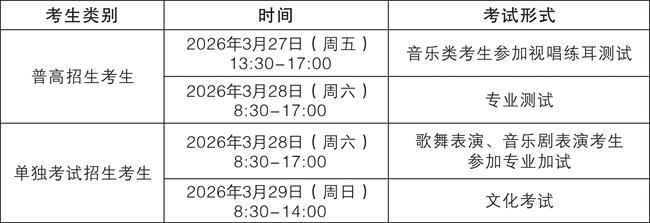 (六)2026年3月27日,普高招生考生资格审核及现场报到,音乐类考生视唱练耳测试;3月28日,单独考试招生考生资格审核及现场报到,歌舞表演和音乐剧考生专业加试;