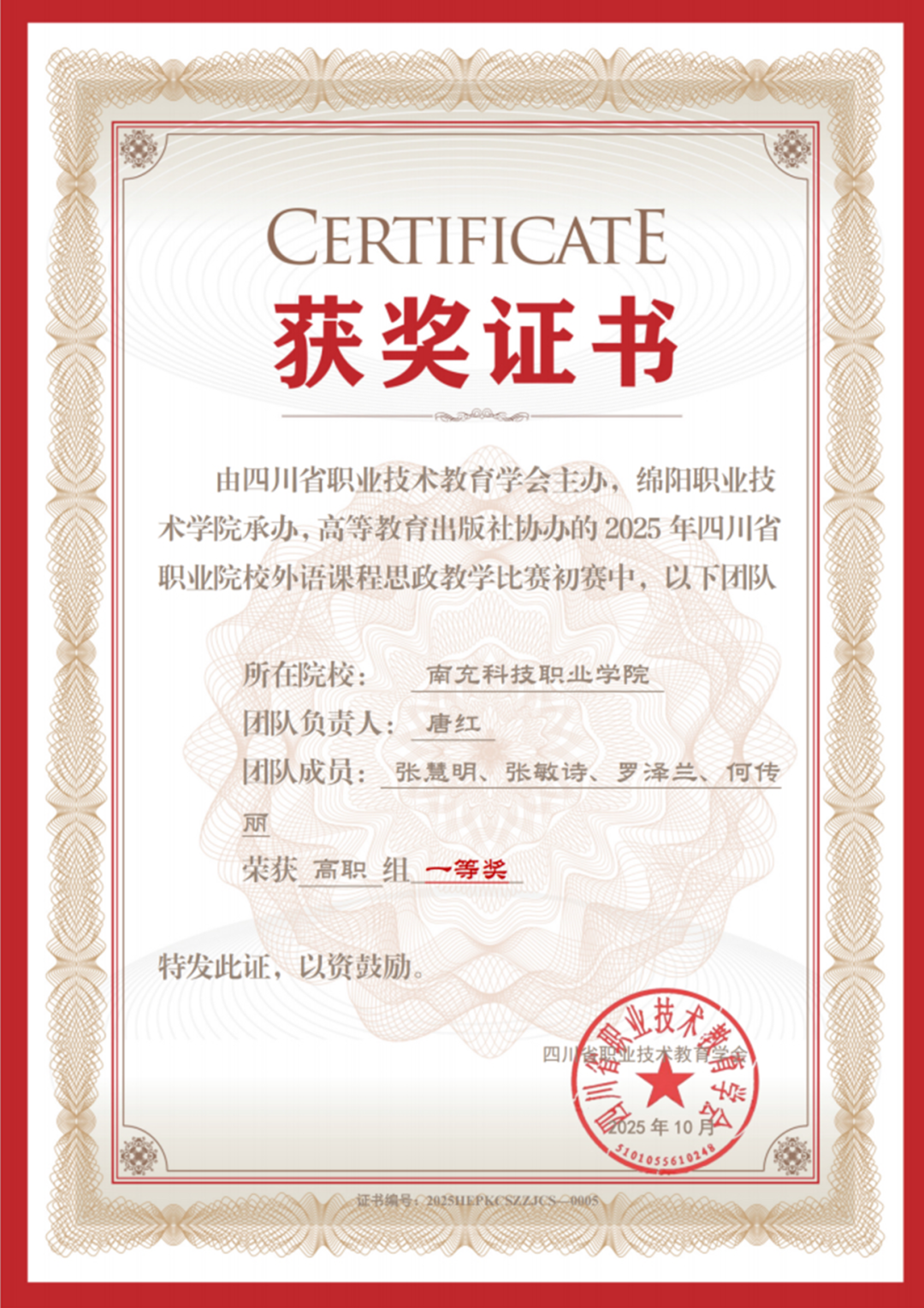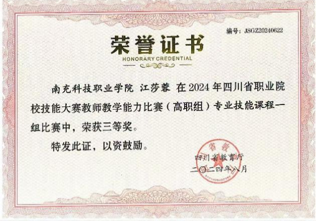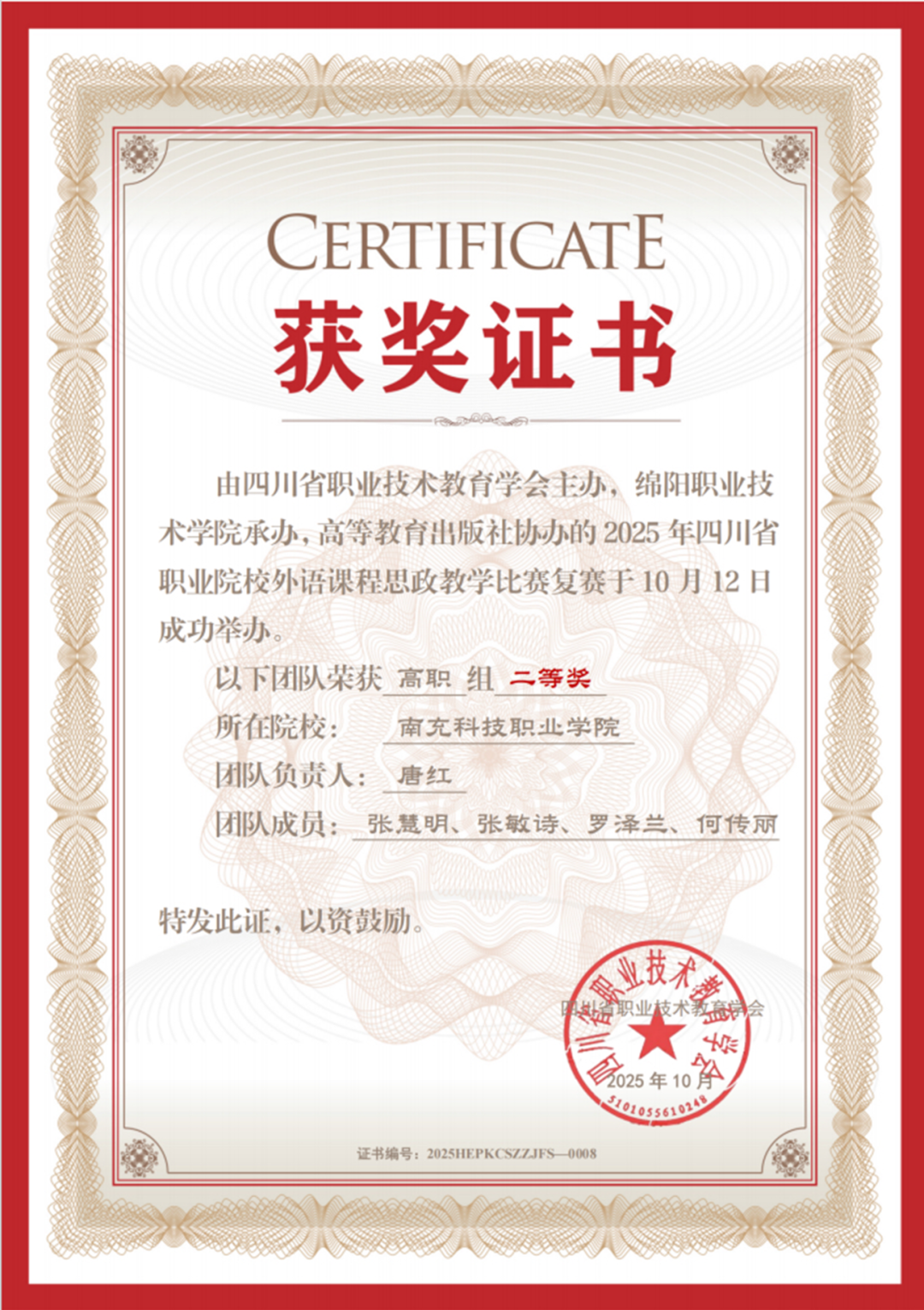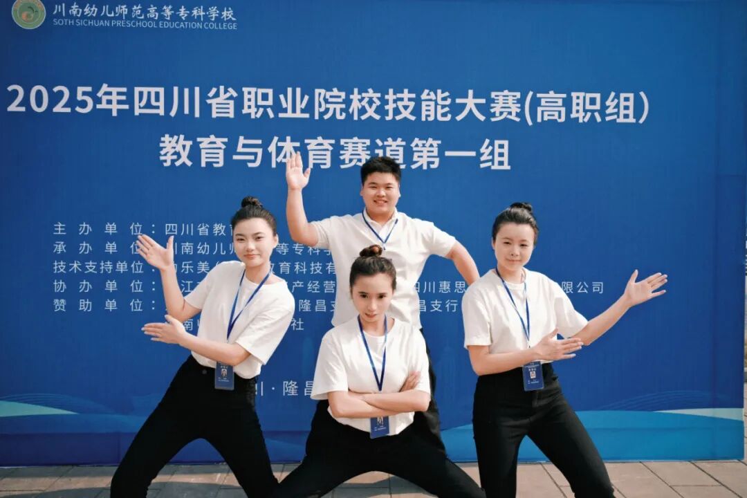 2025年四川省职业院校技能大赛教育与体育赛道,学前教育专业学生杨伟翔、卢洌、张雪婷、崔蒨颖(指导教师:何晓、康文迪)荣获三等奖。