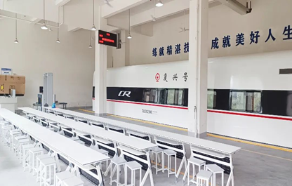 面积150平方米,高铁舱1:1还原客舱环境,搭配真实的餐车、客座、吧台、储藏箱、模拟播音及安全演示等道具,现场布局依照问询、安检室、候车等任务情景构成。主要承担《高速铁路动车乘务实务》《高速铁路客运组织》《高铁英语》《高速铁路安全与应急》等核心课程实训。