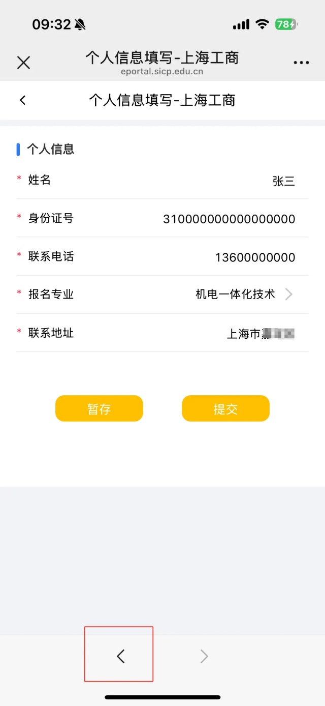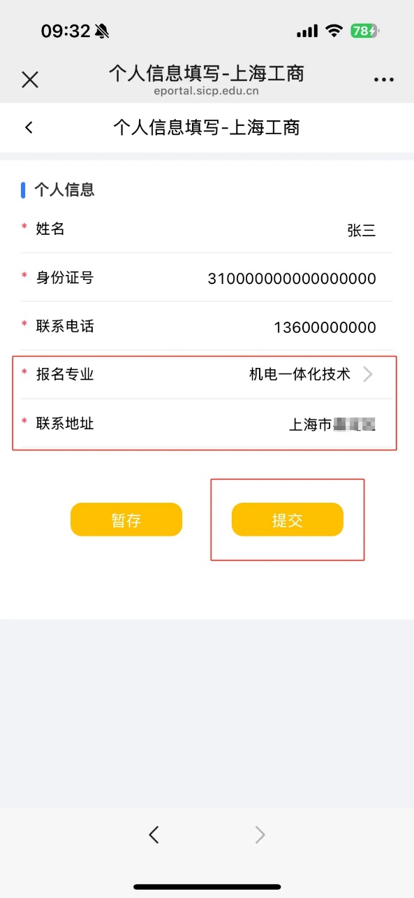 4.点击“个人信息填写-上海工商”进入,选择实际报考我校的第一专业,填写联系地址并提交。