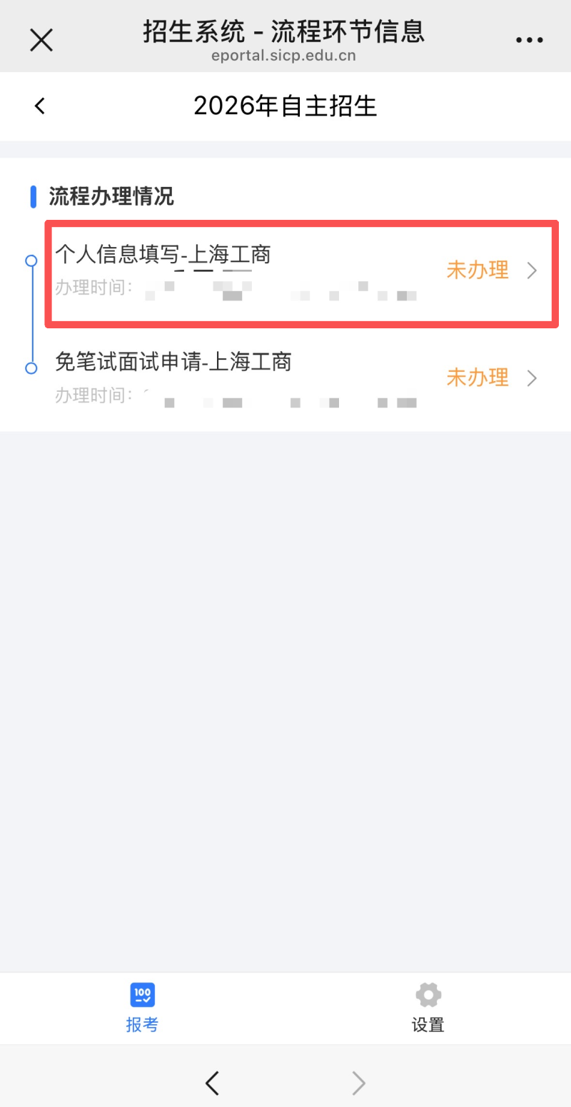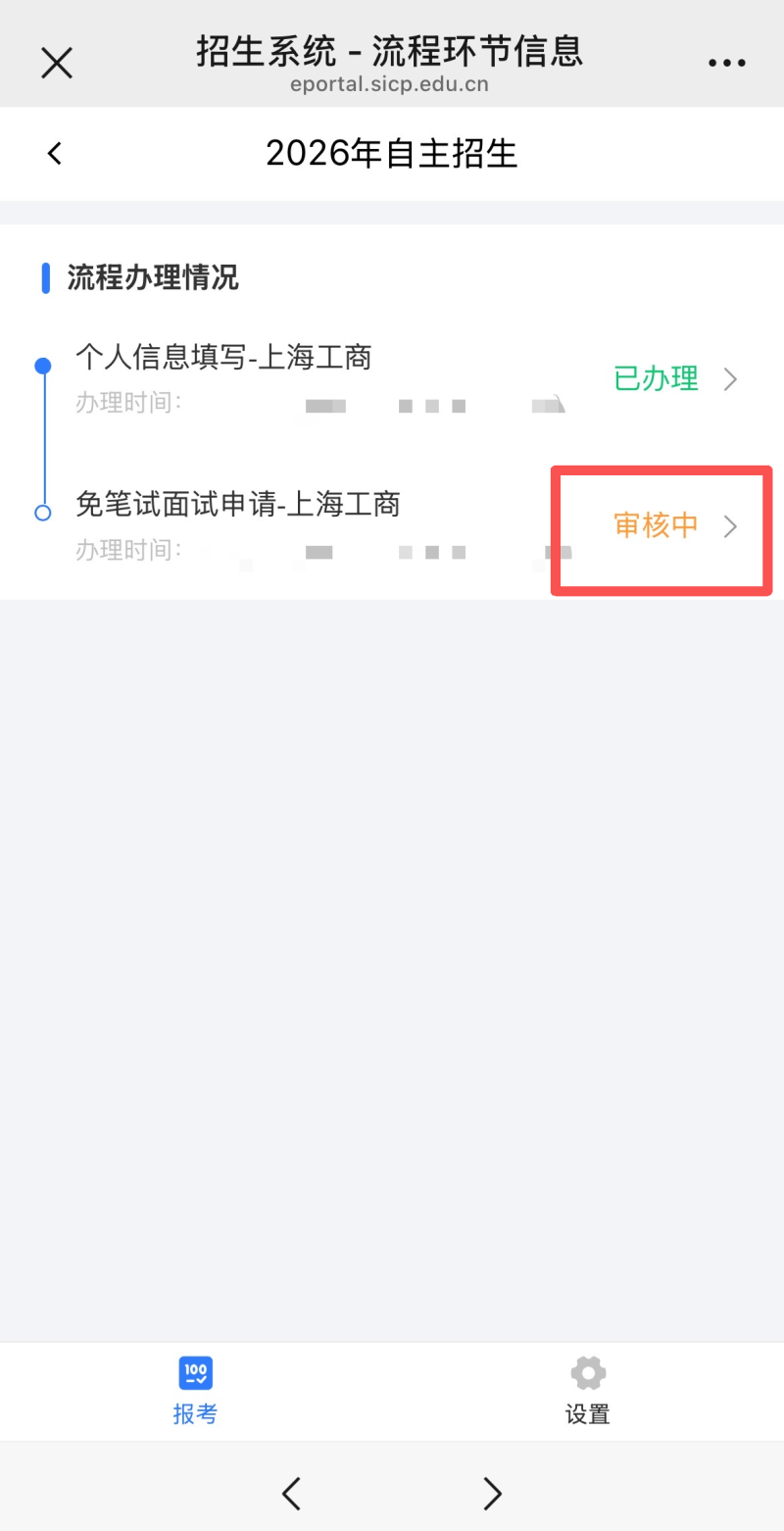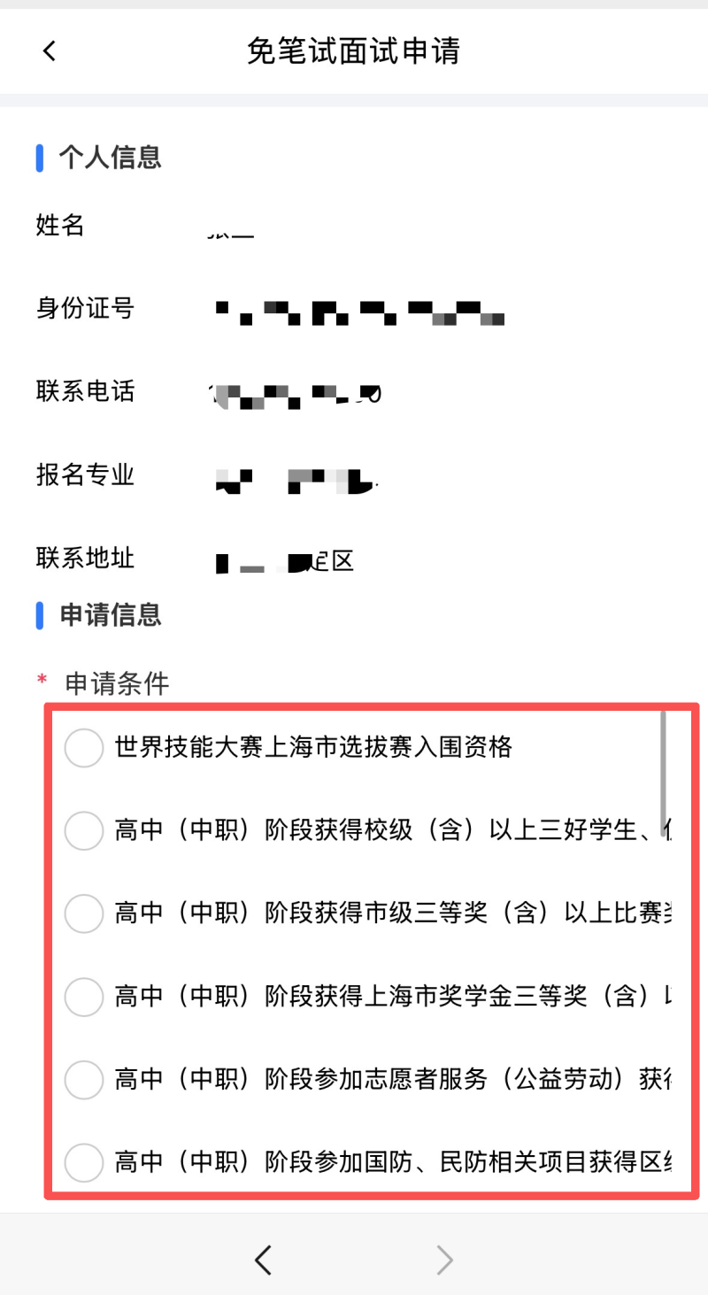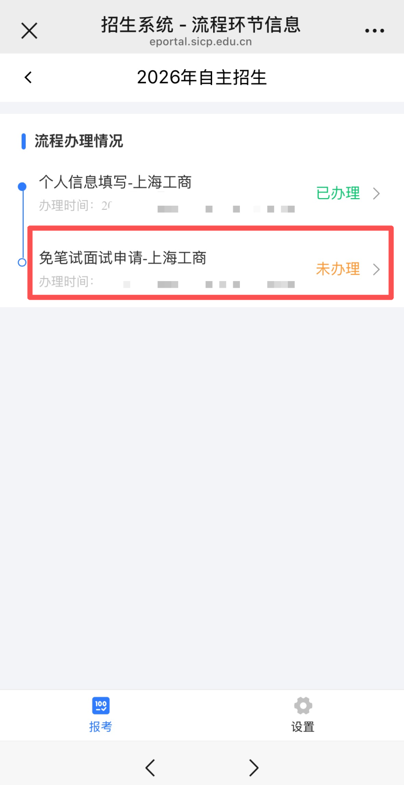 5.返回上一步,将会看到个人信息填写这一步骤显示已办理,然后点击“免笔试面试申请-上海工商”。