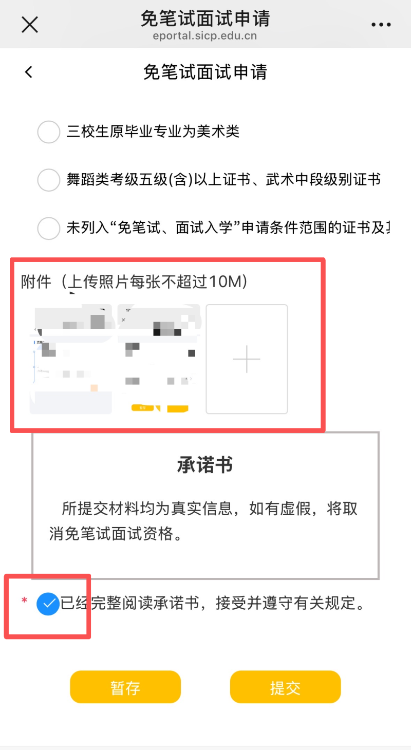 6.选择所符合我校免笔试面试的任一条件并上传相应的附件,附件最多上传三张,选择"高中生七门学业水平合格性考试(思想政治、历史、地理、物理、化学、生物学、信息技术)成绩均合格"或"三校生三门学业水平考试等级取得1A或2B-或3C-及以上"的应届考生可不提交附件,勾选已阅读承诺书,然后提交免试申请。