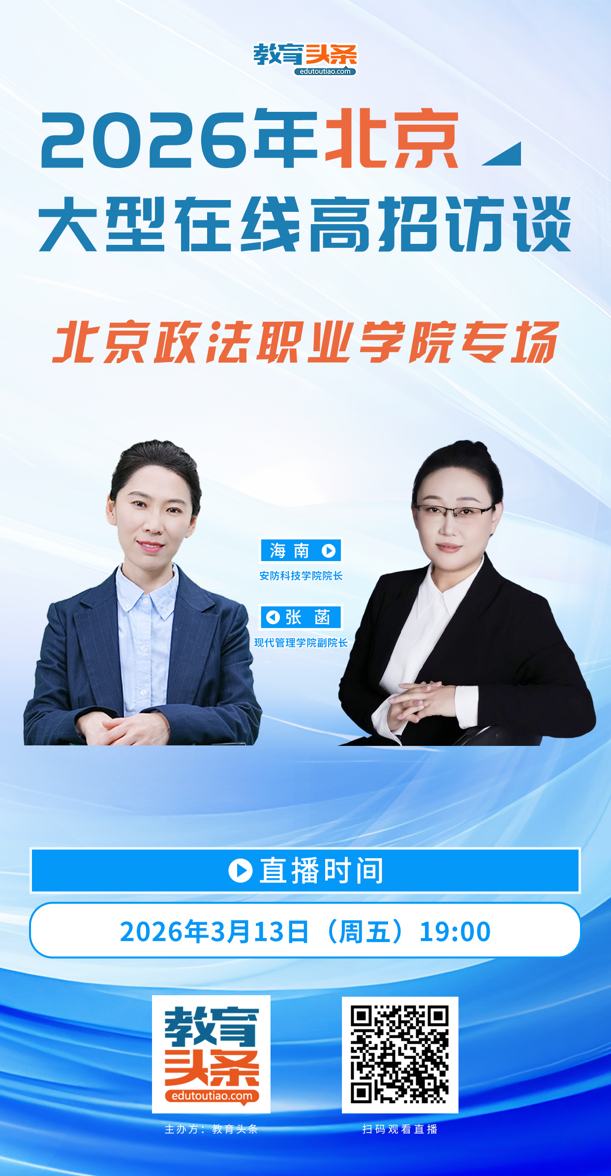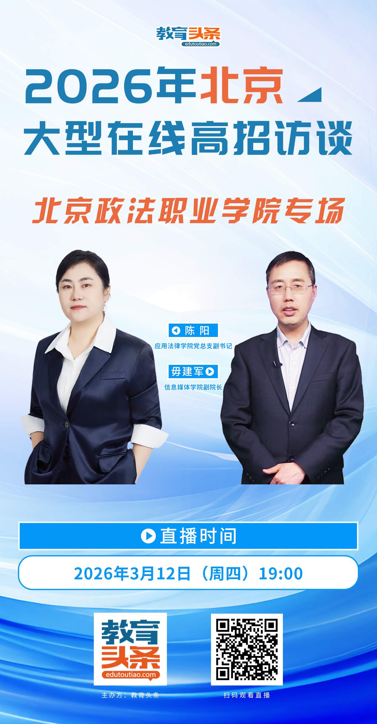 为方便考生和家长深入了解学院招生政策及招生专业信息,北京政法职业学院于12-13日晚上19:00开展招生直播宣讲活动。欢迎考生和家长微信扫码观看,届时学校四个二级学院的院长、党总支副书记、副院长及各专业负责教师会在直播间等候与大家“线上交流”。